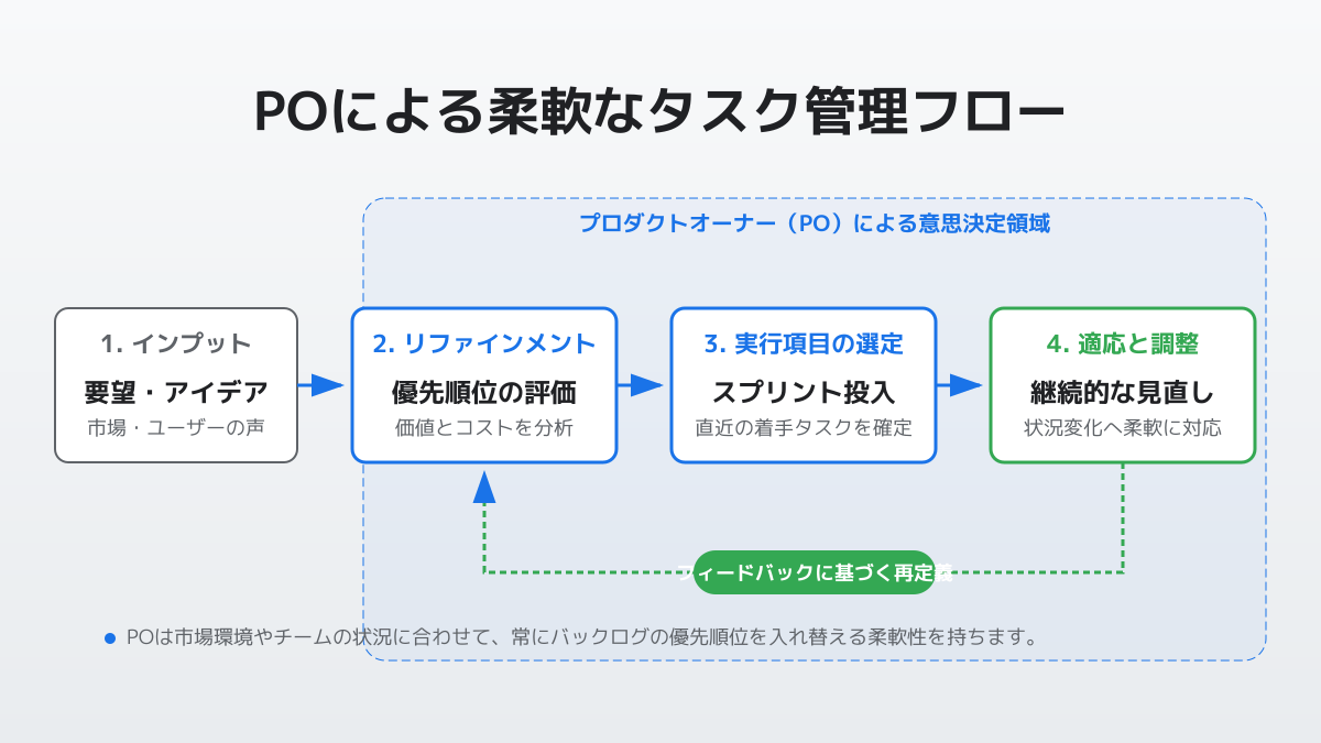 アジャイル開発におけるPOは、プロダクトの価値を最大化する責任を担い、「何をつくるか」を最終決定する唯一の意思決定者として機能します。一方で、日々のタスク管理や進捗追跡は、基本的には開発チームやスクラムマスターの役割となります。POは「なぜそれを作るのか」「どの機能から着手すべきか」という優先順位の決定に集中し、具体的な作業分解は開発チームに委ねるのが適切なアプローチです。