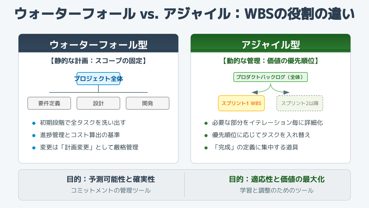 WBS自体が不要なわけではありません。初期段階で数ヶ月先のタスクまで詳細に分解する「固定化されたWBS」が不適切というだけです。大きな機能群(エピック)で全体像を可視化し、直近のスプリント分だけを詳細にタスク分解する「柔軟なWBS」の運用を推奨します。