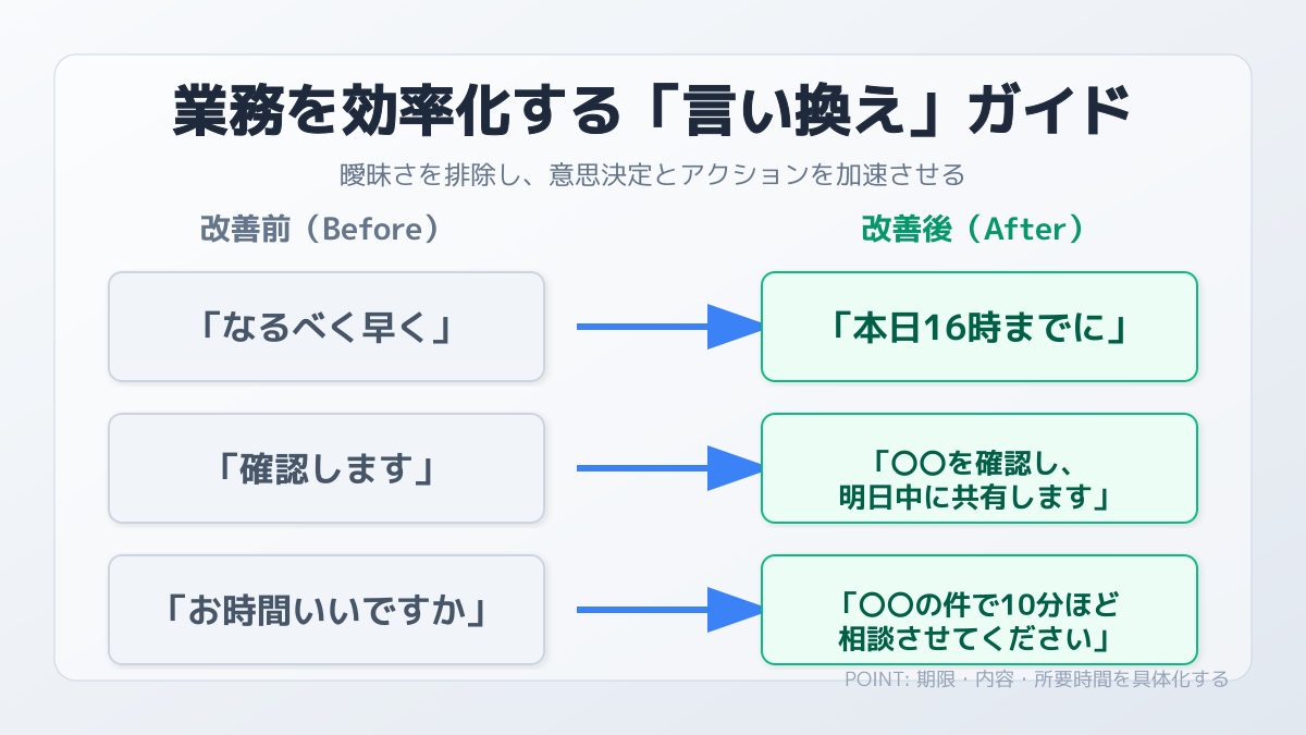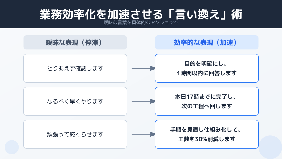 業務効率化の言い換えを実際の運用に落とし込むときは、本文で整理した判断基準を順に確認してください。