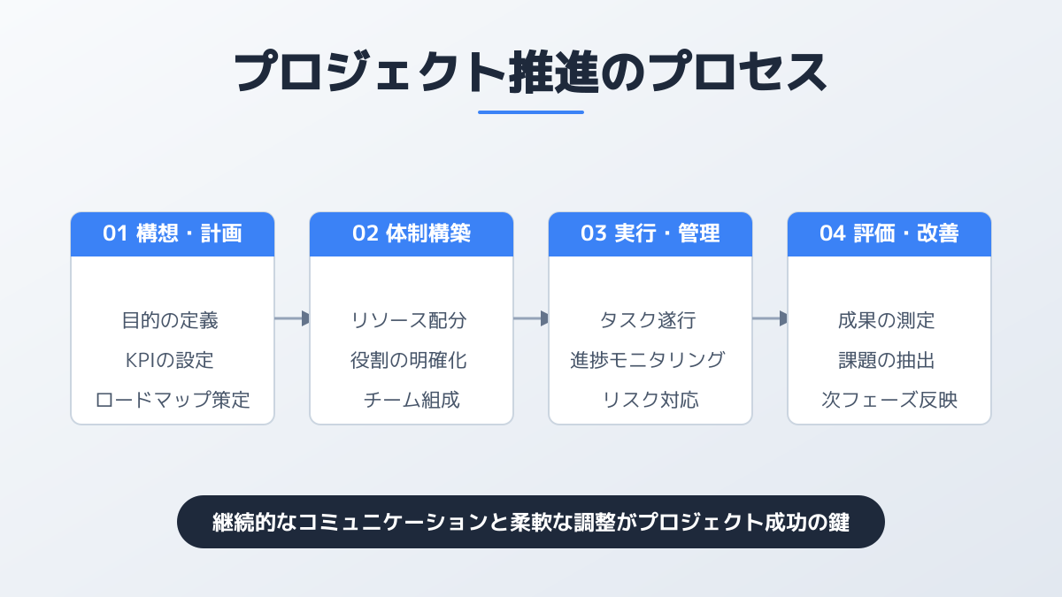 従来の「作業時間の短縮」といった守りのKPIから、「新しい顧客体験の創出」や「自律的な改善提案の件数」といった価値創造を測るKPIへアップデートします。財務面だけでなく、顧客体験・組織文化・IT基盤という多角的な視点から評価することで、新しい行動様式を企業文化として根付かせます。KPIや戦略の具体的な立案プロセスについては、【2026年版】企業の「IT戦略」企画プロセス完全ガイド|IT戦略部の役割と実践ノウハウ や 【2026年版】データ活用戦略の立て方完全ガイド|データドリブン経営を実現する5つの手順と企業事例 も合わせて参照してください。
