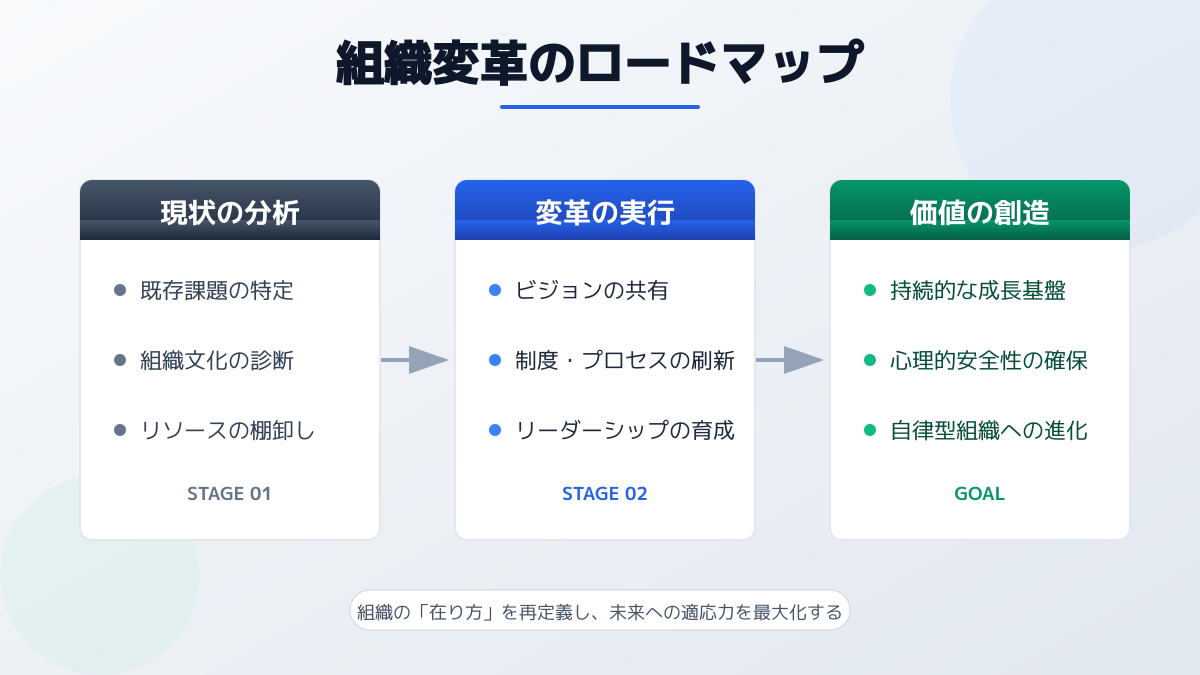 現場の抵抗を乗り越えて変革を進める具体的な手順については、組織変革プロセス7つのステップ や、チェンジマネジメントとは?DXの組織変革を導く6つの実践手順 を参考にしてください。