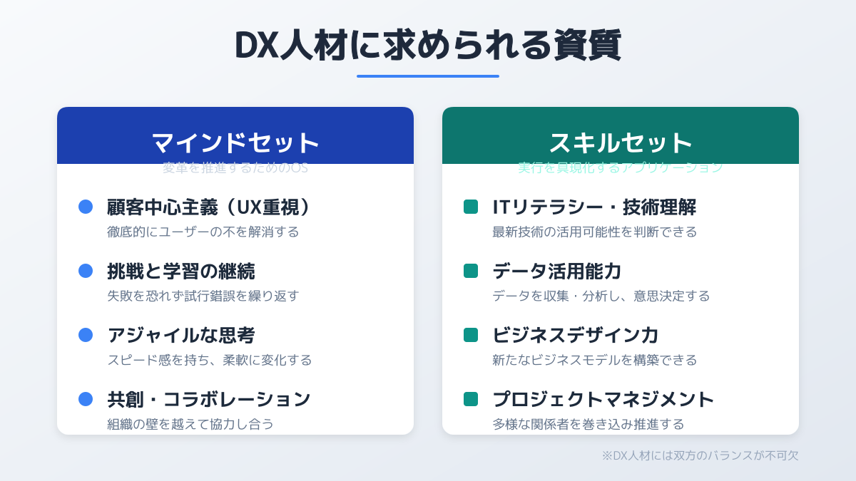 その結果、新たなデジタル技術を活用してビジネスモデルの変革を牽引する人材が圧倒的に不足しています。システムのお守りをする従来型のIT人材ではなく、ビジネスとテクノロジーの橋渡しを行い、変革を主導できる人材の確保が急務です。企業がこの課題を乗り越えるためには、まず「自社にとってどのようなスキルとマインドセットを持った人材が必要なのか」という、明確なDX人材の定義が不可欠となります。