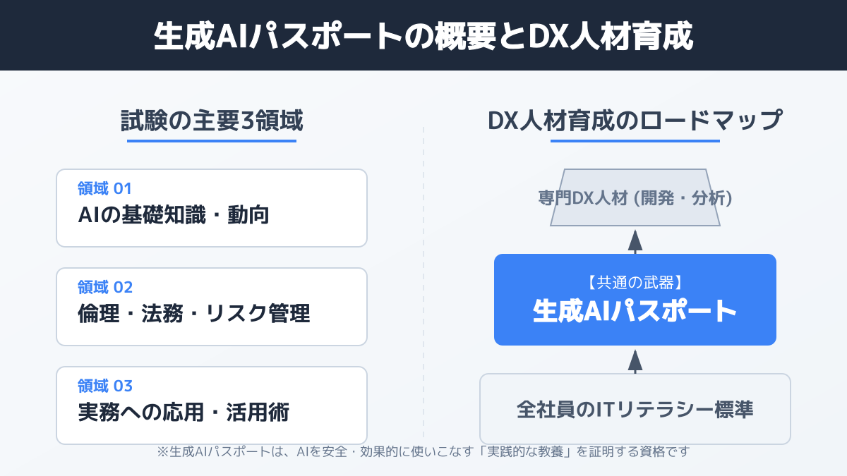 生成AIを安全に運用するためには、従業員一人ひとりのリテラシー向上が不可欠です。そのための有効な手段として注目されているのが、生成AIパスポートの導入です。ここでは、資格の概要と取得によるビジネス上のメリットを解説します。
