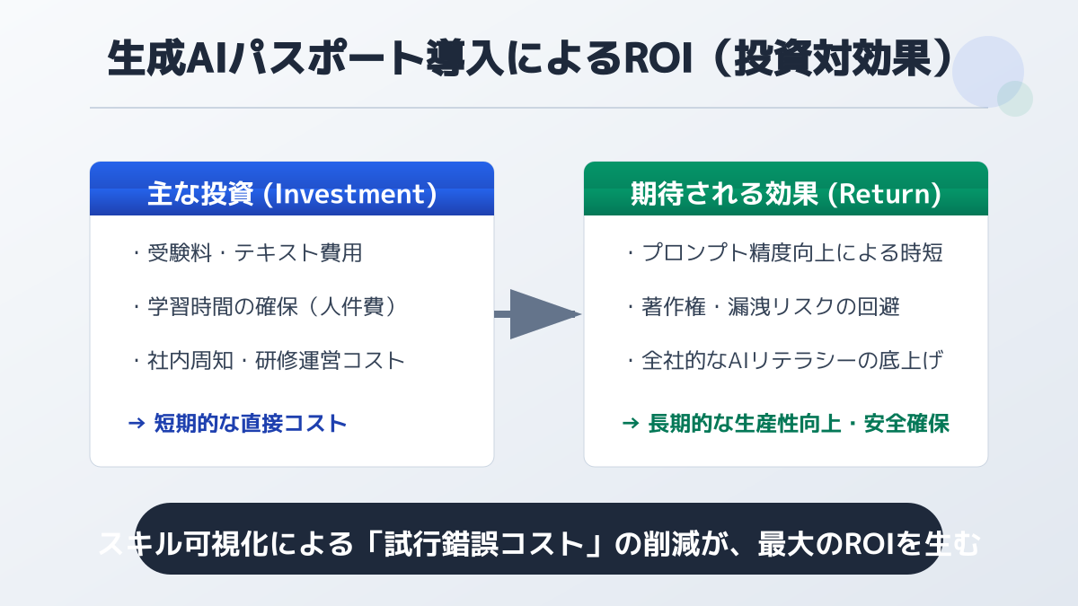 中小企業がDX人材育成を進める上で、資格取得後の効果測定と現場への定着は非常に重要なフェーズです。ここでは、生成ai パスポート導入による投資対効果(ROI)の考え方と、実際の業務に適用する際のアプローチについて解説します。
