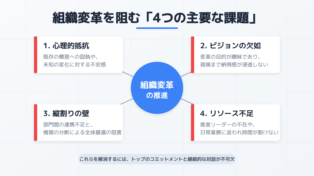 組織変革における従業員の抵抗は避けられない課題です。変革の意義を丁寧に伝え、当事者意識を醸成するためには、リーダーシップによる巻き込みと従業員との継続的な対話が求められます。
