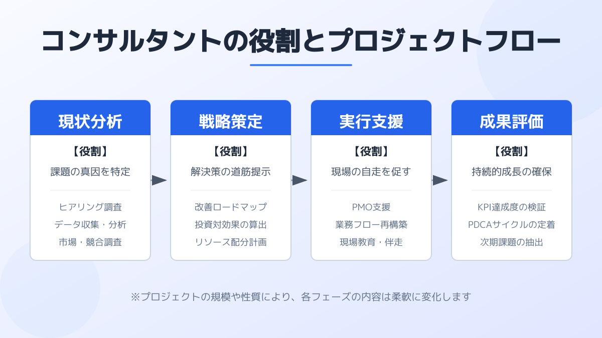 美しい戦略を描くだけでなく、現場に変化を根付かせ、自律的に運用できる状態まで導く実行力が問われます。システムを導入して終わりではなく、新しい業務プロセスを定着させる泥臭い支援こそが求められます。
