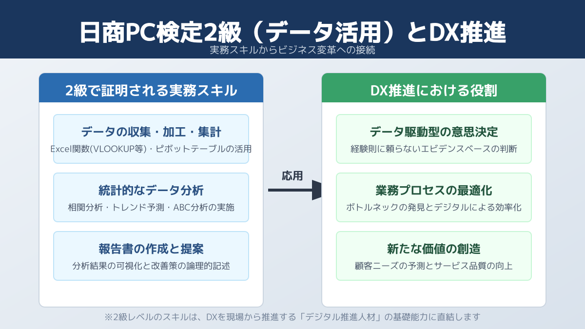 検定で学ぶデータ処理手法は、IT部門だけでなく、営業、人事、マーケティングなどあらゆる部門の業務効率化に応用可能です。DXを推進する経営層にとって、「日商PC検定2級 データ活用」は現場社員のデータリテラシーを底上げする明確な到達目標として機能します。