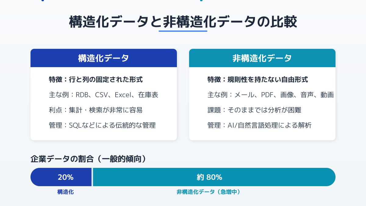 データ活用とは、企業内に蓄積された情報を分析し、意思決定の迅速化や業務プロセスの改善に役立てる取り組みです。多くの企業がDXを推進する中で、最初の壁となるのが非構造化データの扱いです。