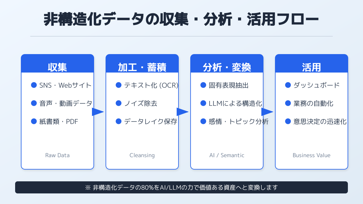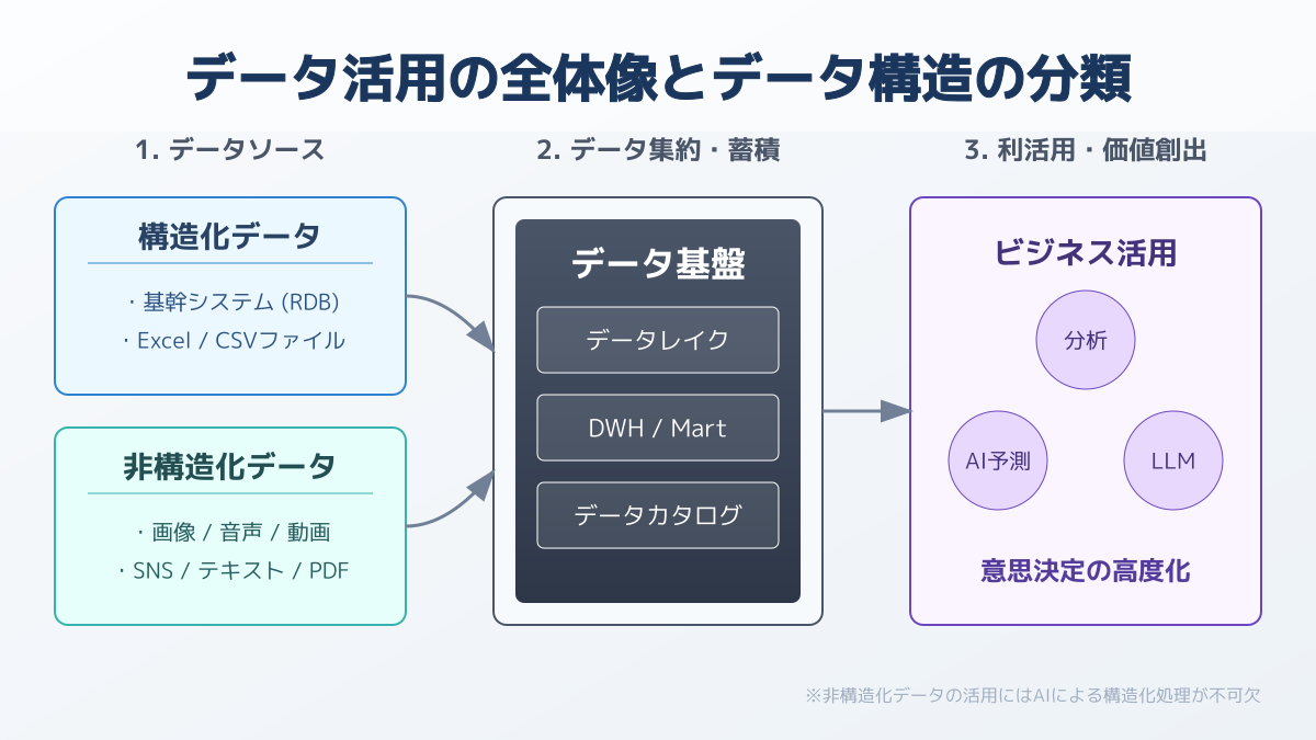 構造化された売上データだけでなく、現場のリアルな声や行動履歴といった非構造化データをいかに取り込むかが、企業の競争力強化に直結します。