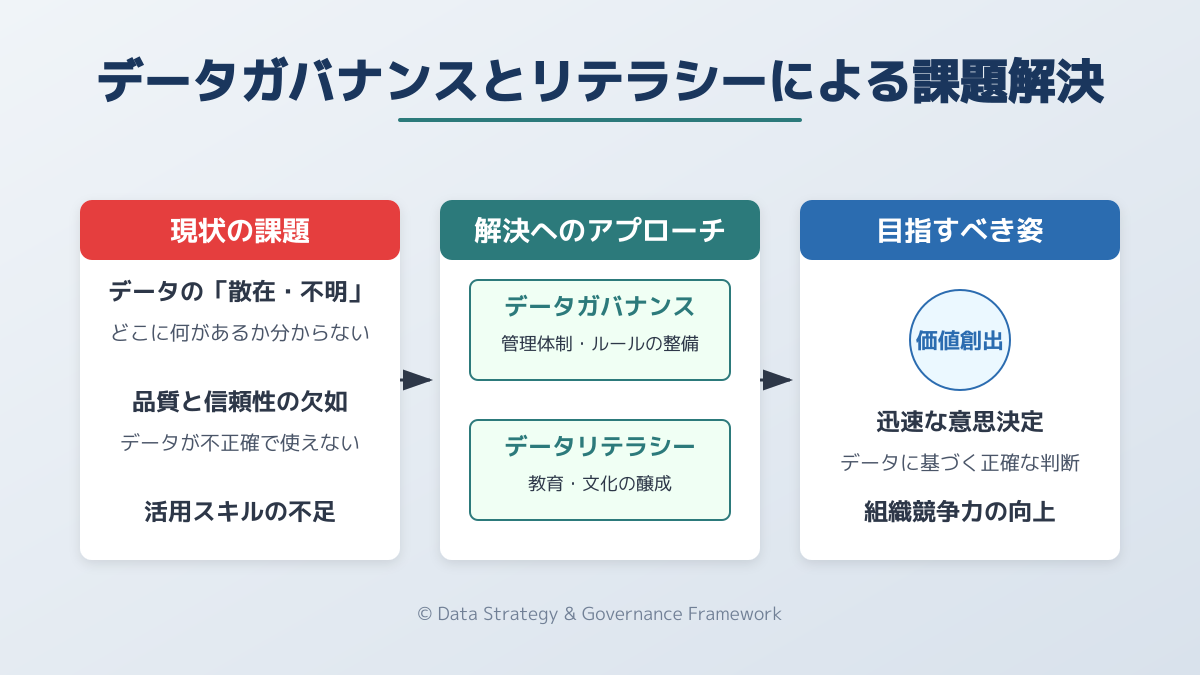 データ品質の維持はもちろんのこと、厳格なアクセス管理、プライバシー保護、そして関連法規やコンプライアンスを遵守するためのフレームワーク構築が喫緊の課題となっています。