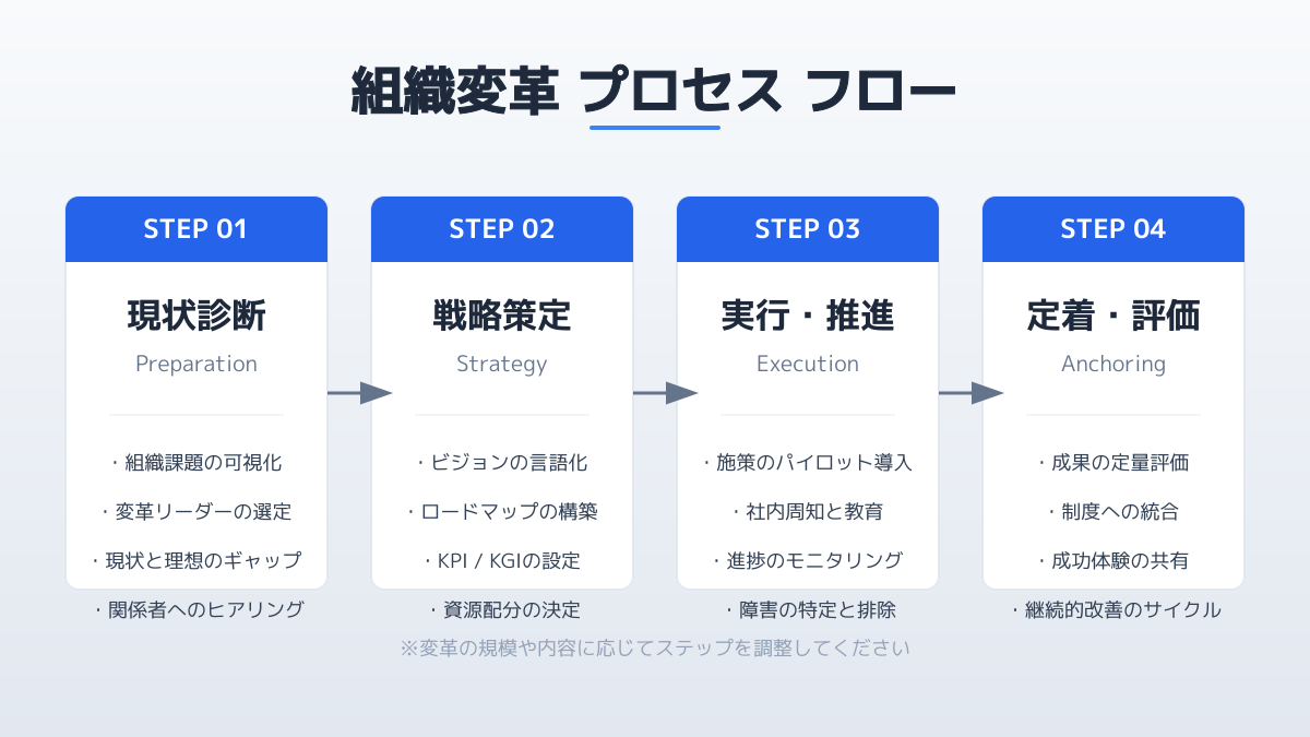 組織変革のステップの第一歩は、経営層が描くビジョンと現場の課題感を接続し、目的を全社で共有することです。「なぜ変わらなければならないのか」が曖昧なままスタートすると、現場は「また新しい業務が増えた」と捉え、協力を得られなくなります。