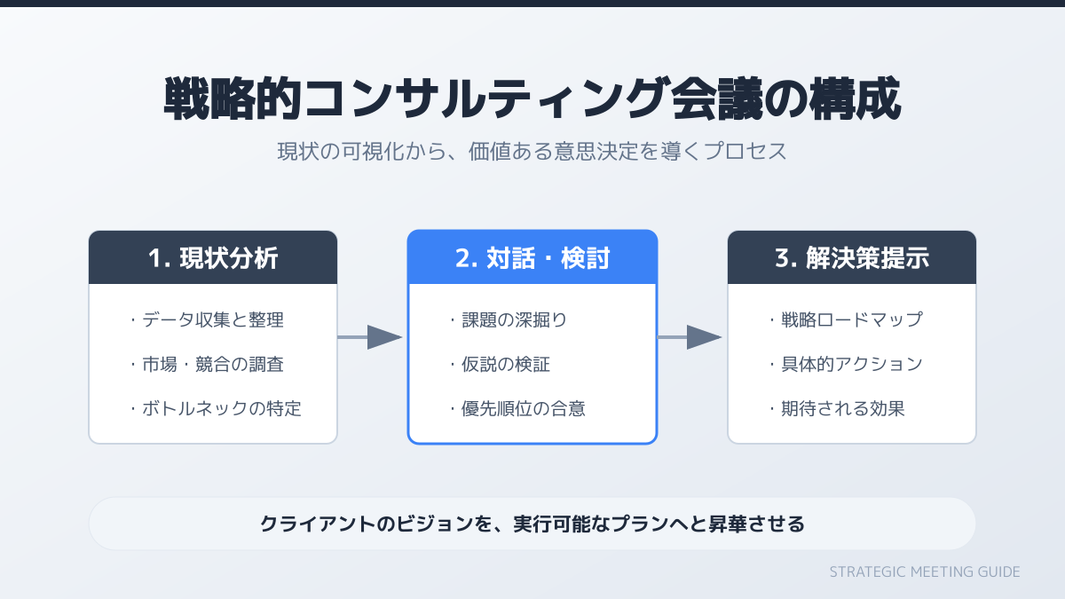 このように、第三者の客観的な視点を入れて現場の不満を論理的に整理しつつ、実務の主導権を自社で握ることで、最終的にコンサルタントが離れても自走できる体制を構築できます。